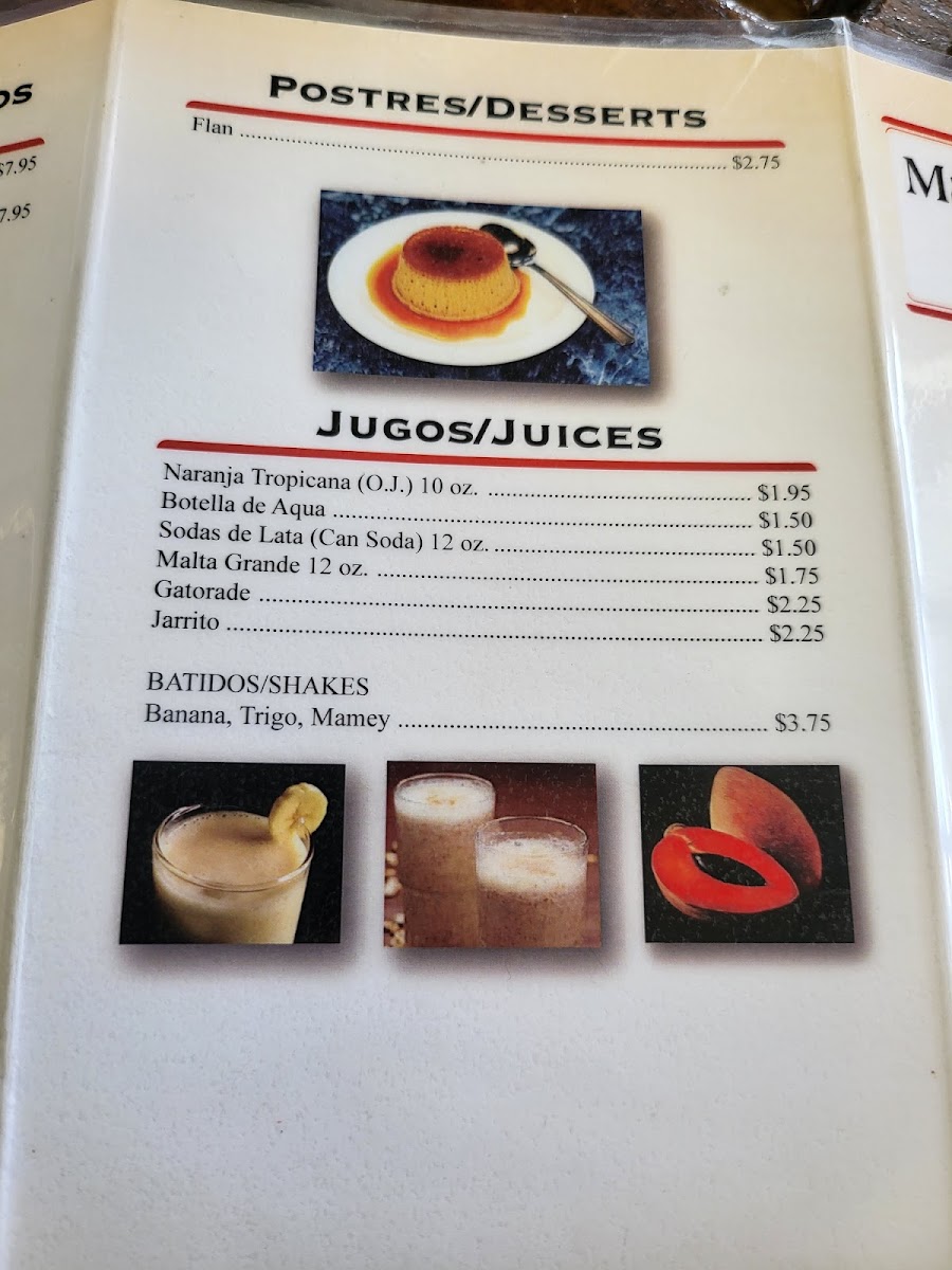 To quench your thirst, the Jugos (Juices) menu offers refreshing options like Naranja Tropicana (OJ.) 10 oz, a fresh and tangy orange juice. If you prefer something more neutral, you can always go for a Botella de Aqua, ensuring you're hydrated with a refreshing bottle of water.